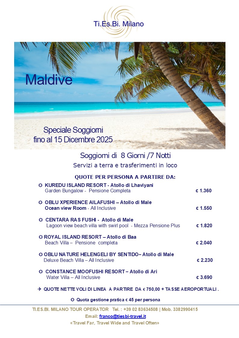 Maldive – SOGGIORNI FINO AL 15 DICEMBRE 2025