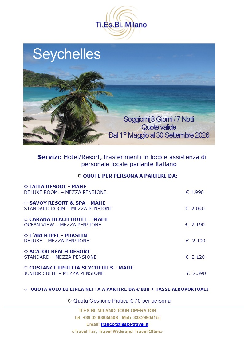 SEYCHELLES – SOGGIORNI DA MAGGIO A SETTEMBRE 2026